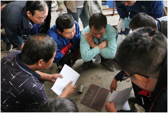 本次大賽為期兩天,分為實際操作和理論筆試兩個環節,此次大賽的參賽者來自27家企業共計48名焊接高手。選手穿戴好防護用具,挑好試板,開始了第一步打磨,緊接著各選手按照順序依次到比賽區域進行比賽。一瞬間焊機轟鳴、弧光閃爍,整個比賽場地,一片忙碌景象。他們個個都拿出看家本領,各展絕技,在電光火石間展示著自己的才能,進行著激烈的角逐。每一個焊工都專注于自己的作品,揮汗如雨,在絢爛的火光之中熠熠生輝,伴著嘶嘶的聲音和焊槍噴吐的耀眼光芒,一件件精美的成品工件漸漸成型。