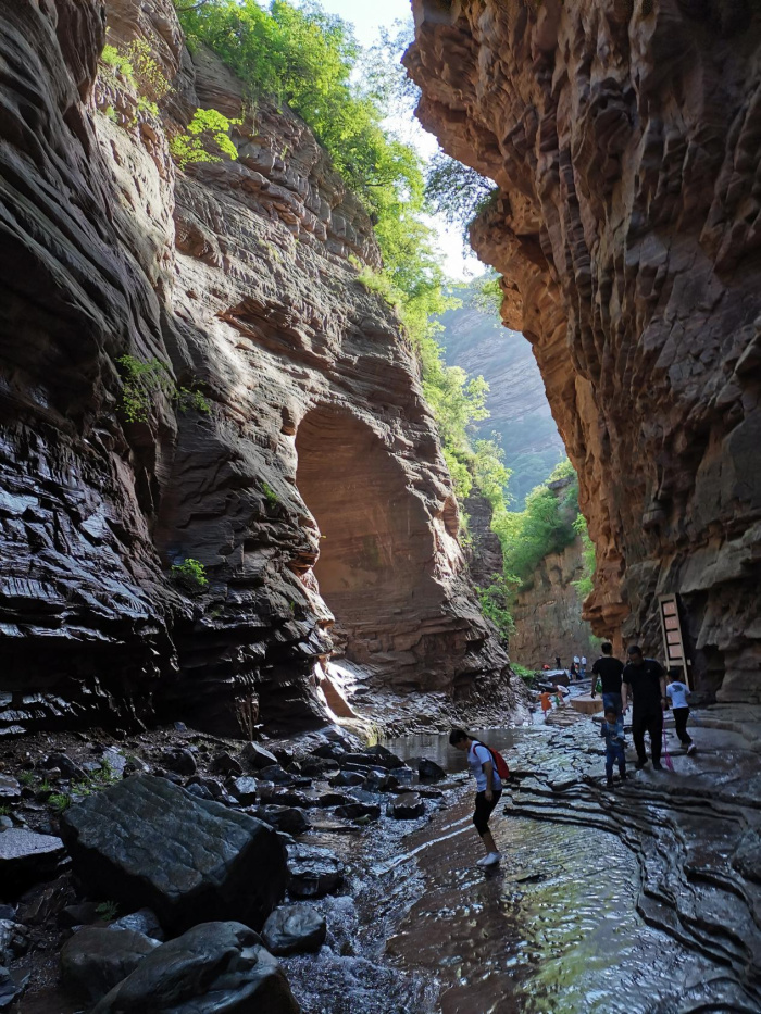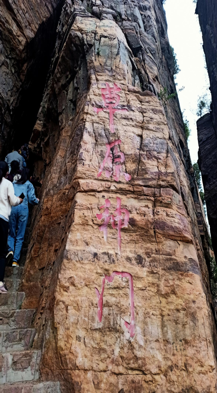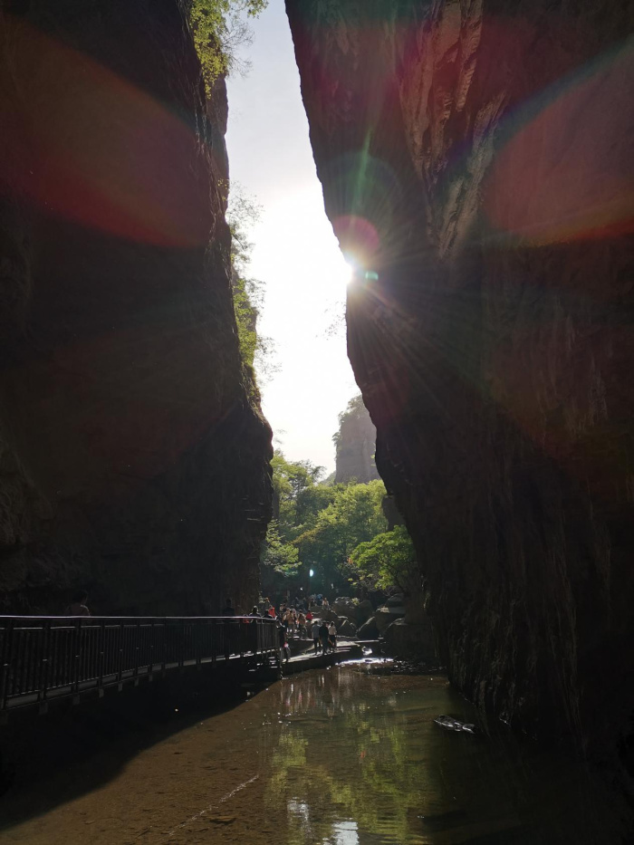 進入景區,眼前美麗的瀑布從高高的山上奔流而下,走在幽幽的峽谷內就如同走在平坦的巷子里。峽谷里充滿了流水潺潺的聲音,溪水清澈見底,各種怪石橫臥在峽谷內,兩岸紅巖絕壁,瀑布飛濺。大家一邊說笑一邊欣賞自然美景,一會兒穿過美麗的蘆葦蕩,一會兒探尋神密的海盜船,一會兒又在宏偉壯觀的天碑前拍照留念。