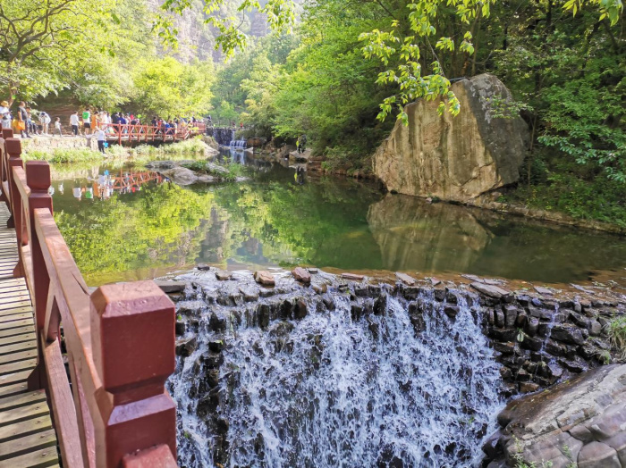 經過幾個小時的長途跋涉,大家到達了洛陽第一站---龍潭大峽谷。這里空氣清新,景色宜人,遠遠望去,山上的樹木密密麻麻,疊翠流金。走進峽谷,我們先觀賞了地質博物館,博物館內展覽著許多的魚化石、葉子、貝殼、珊瑚等,形狀千奇百怪,看得大家目瞪口呆,在這里我們開拓了視野,增長了知識。